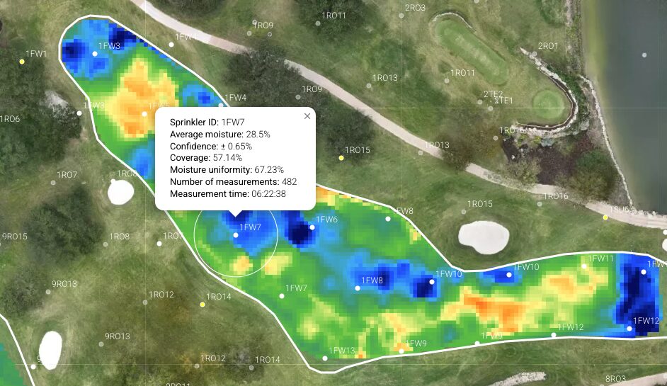 同社のサービスでは独自のセンサーを使って、これまで目視や点測りで行っていた土壌水分量を自動でマッピングすることで、散水制御システムと連携した自動補正により散水量を最大で20-30%削減しており、これに高温時の水不足解消はもとより、過剰散水による病害の発生、泥濘によるプレーアビリティの低下などのメリットを提供しています。