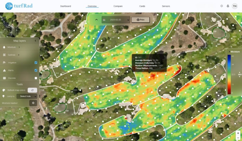 これだけ水が貴重なエリアでなぜ2300個ものスプリンクラーを付けているのかを聞いたところ、実はオリンピッククラブではフェアウェイモアに「TurfRad」という土壌水分を計測してGPSと連携してマッピングするシステムを使っており、ICシステムで個別に制御されたスプリンクラーで、乾燥したエリアだけにピンポイントに散水できます。効率的な散水は節水だけではなく、加湿による病原の抑制や、泥濘によるダメージの防止など、管理資材や労働の削減とターフ品質の向上への効果も期待できます。